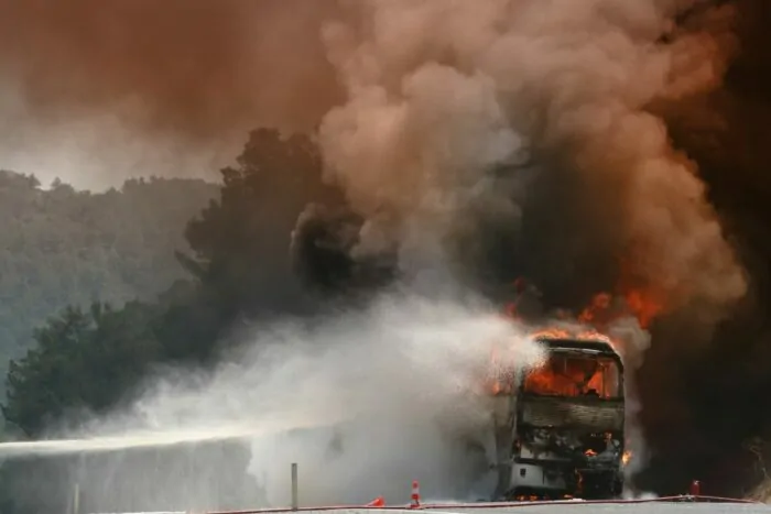 Der Bus kollidierte mit einem Lastwagen. Die Folge: Ein Großbrand im Autotunnel!
