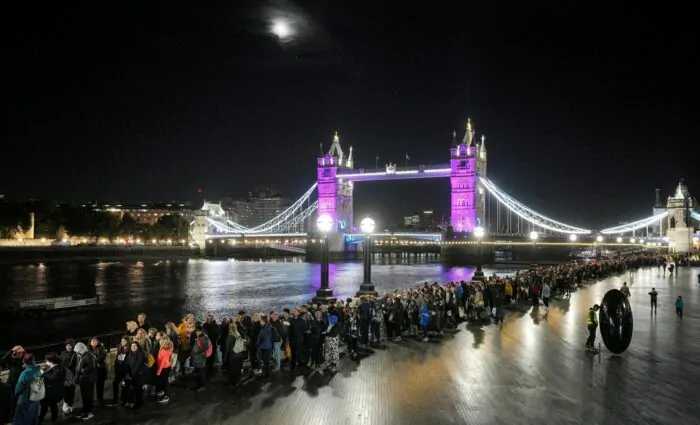 König Charles III. und sein Sohn Prinz William haben die Wartenden in der kilometerlangen Schlange zum Sarg von Queen Elizabeth II. am Themse-Ufer in London mit einem Besuch überrascht. Tausende Trauernde harrten dort auch am Samstag stundenlang aus, um der Königin die Ehre zu erweisen – viele davon über Nacht.