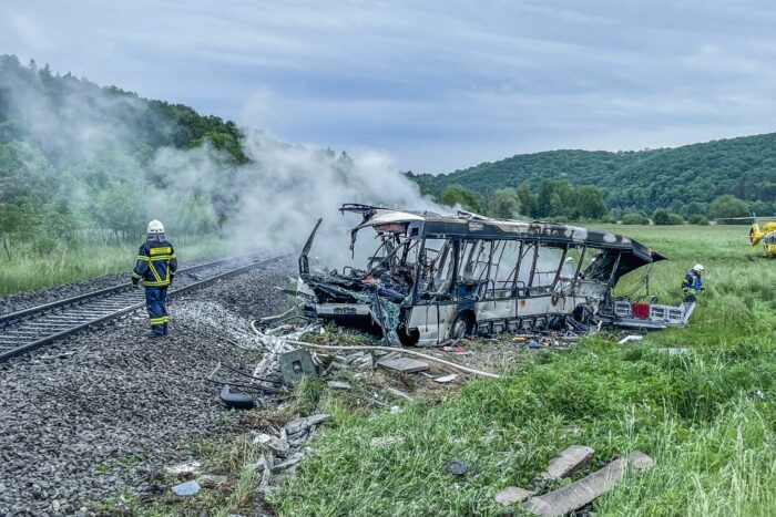 Schock am frühen Morgen: An einem Bahnübergang kollidiert ein durchfahrender Zug mit einem Bus. Der Bus brennt aus, mehrere Menschen sind schwer verletzt.