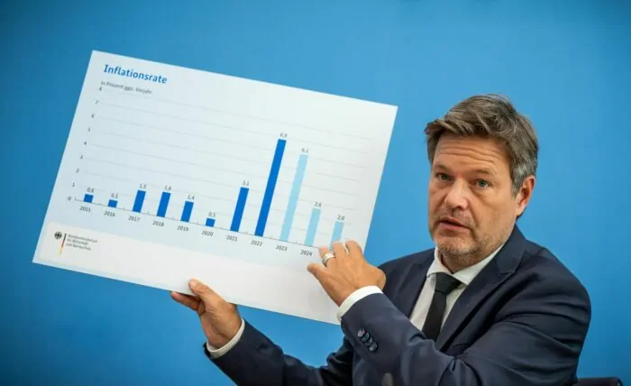 Habeck sprach von einem Lichtblick. Der Rückgang der Inflation sei deutlich, damit stiegen auch wieder die Realeinkommen – was Grundlage für eine binnenwirtschaftliche Belebung sei. Derzeit schwächelt der private Konsum immer noch.