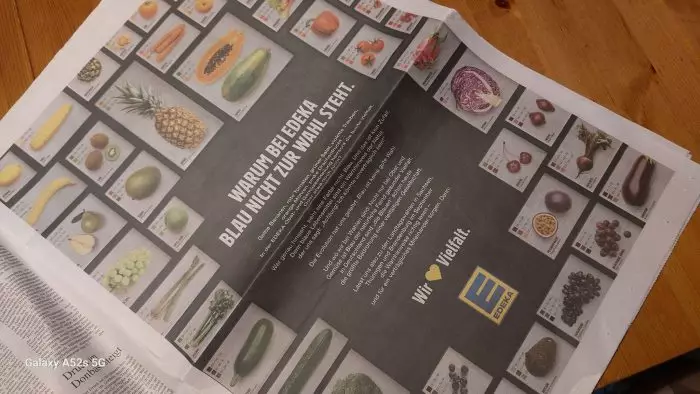 Wenige Tage vor den Landtagswahlen in Sachsen und Thüringen ergreift auch der Handel Position. Die Supermarktkette Edeka veröffentlichte einen ganzseitigen Aufruf in der «Frankfurter Allgemeinen Zeitung», in der Wochenzeitung «Die Zeit» sowie in den sozialen Netzwerken. Die Anzeige ist mit betitelt mit dem Satz «Warum bei Edeka Blau nicht zur Wahl steht». Dies ist als Anspielung auf die AfD zu verstehen, die Blau seit ihrer Gründung als Parteifarbe benutzt.