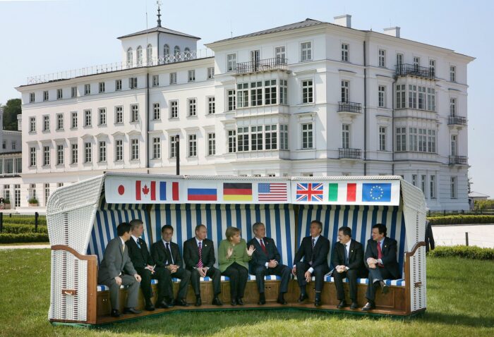 Deutschlands nach eigenen Angaben älteste heute noch bestehende Strandkorbmanufaktur hatte für den G8-Gipfel 2007 einen sechs Meter langen Riesenstrandkorb gebaut, in dem die damalige Bundeskanzlerin Angela Merkel zusammen mit den Mächtigen der Welt Platz nahm – das Bild ging um die Welt. Zu der Gruppe der Industrienationen zählte damals auch noch Russland – heute heißt die Gruppe nach dem Ausschluss Russlands G7 statt G8. In Heiligendamm nahm Merkel noch neben dem russischen Präsidenten Wladimir Putin im Strandkorb Platz.