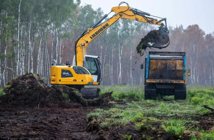 Stück für Stück schaufelt ein Bagger die oberste grüne Bodenschicht ab und lädt sie auf eine Art LKW mit Kettenantrieb. Was bleibt, ist eine weiträumige dunkelbraune Mondlandschaft im Göldenitzer Moor südöstlich von Rostock.