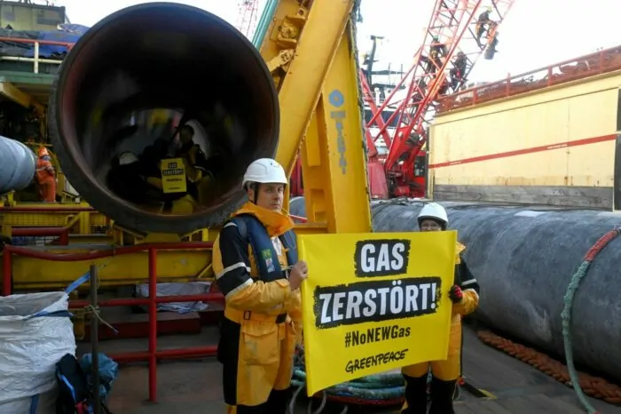 Nach früheren Angaben waren bei dem Einsatz auch ein Hubschrauber und Polizeiboote im Einsatz. Fotos zeigten auch Aktivisten auf der Pipeline sitzend, auf dem Übergang vom Schiff ins Wasser. Auf der Röhre war «No New Gas» zu lesen. An dem Verladekran hatten Aktivisten ein Banner mit der Aufschrift «Gas zerstört» angebracht.