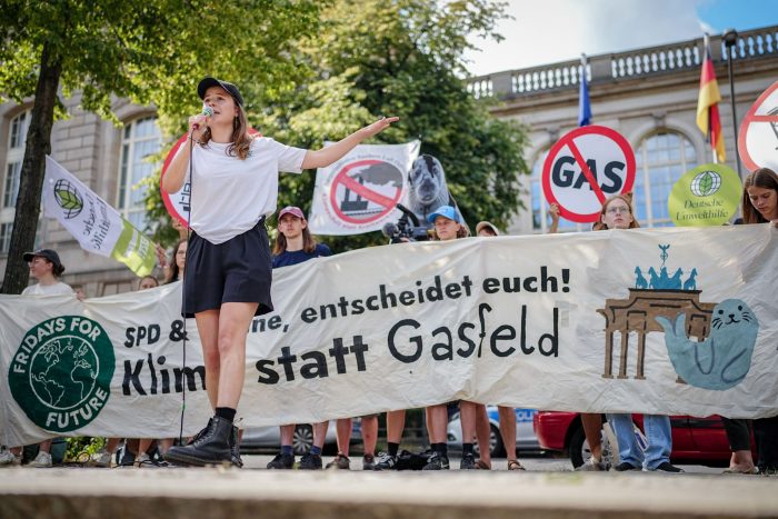 Über 100 Klimaaktivisten haben vor dem Bundeswirtschaftsministerium in Berlin gegen die geplanten Gasbohrungen vor der Nordseeinsel Borkum protestiert. Sie hielten ein langes rotes Textilband vor sich, das die rote Linie darstellen sollte, die nicht überschritten werden dürfe. Luisa Neubauer, Organisatorin von Fridays for Future, führte die Demonstration zum Ministerium an.