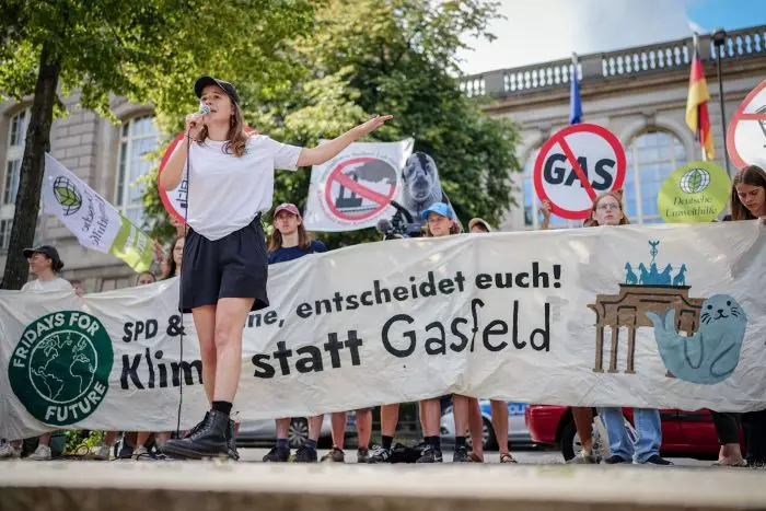 Über 100 Klimaaktivisten haben vor dem Bundeswirtschaftsministerium in Berlin gegen die geplanten Gasbohrungen vor der Nordseeinsel Borkum protestiert. Sie hielten ein langes rotes Textilband vor sich, das die rote Linie darstellen sollte, die nicht überschritten werden dürfe. Luisa Neubauer, Organisatorin von Fridays for Future, führte die Demonstration zum Ministerium an.