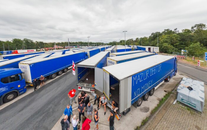 Autofahrer, die auf der seit Freitag für Lastwagen gesperrten Raststätte eine Pause einlegen und neugierig auf die Masse blauer Lastwagen auf dem bis zum letzten Platz gefüllten Parkplatz blicken, können so gleich sehen, worum es den Fahrern geht. Sie warten auf ausstehenden Lohn von der polnischen Spedition, für die sie auf deutschen Autobahnen unterwegs sind. Geld haben sie seit Monaten nicht gesehen, ihre Familien ebenso wenig.