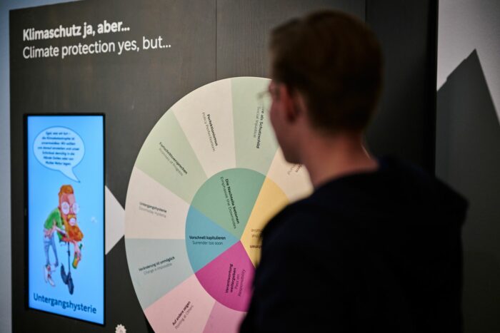 Mit Bildern von überschwemmten Städten, geschrumpften Gletschern und Eisbären auf einer Mülldeponie spielt die Ausstellung bewusst mit den Emotionen der Besucherinnen und Besucher. Reagieren wir bockig, geschockt oder vielleicht kampfbereit angesichts des Ausmaßes der Klimakrise? Die Verantwortung soll laut den Kuratoren aber nicht auf den Einzelnen abgeschoben werden. «Es geht darum, dass Wirtschaft und Politik mitmachen», sagte Kurator Sebastian Daniel Mall bei einem Presserundgang.