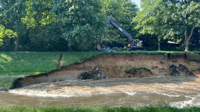 Am Unterlauf der Emscher hatte es nach den heftigen Unwettern bereits am Freitag große Probleme mit dem Hochwasserschutz gegeben. Der Deich sei auf Hunderten Metern erodiert, teilte das Umweltministerium mit. In der Nähe befindet sich ein Wohngebiet mit etwa 100 Häusern – zwischenzeitlich stand die Frage im Raum, ob das Wohngebiet evakuiert werden muss. Feuerwehr, Technisches Hilfswerk, Polizei und zahlreiche Spezialisten waren im Großeinsatz.