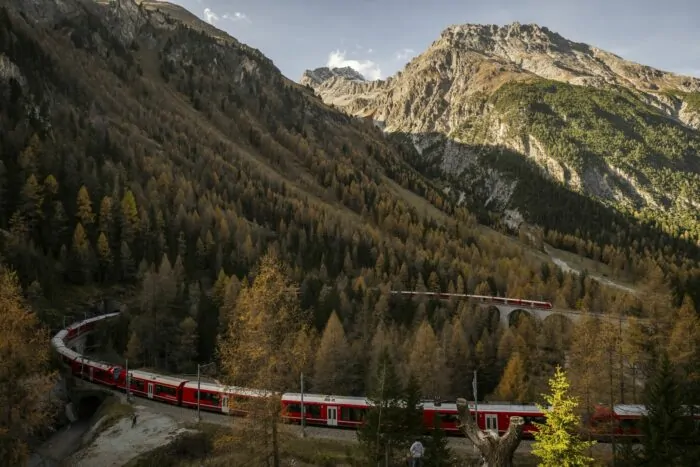 Der Zug fuhr mit 35 Kilometern in der Stunde auf der Unesco-Weltkulturerbestrecke zwischen Thusis und St. Moritz. Die Strecke von Preda über Bergün und über das Landwasserviadukt führte über Brücken und durch Kehrtunnel, die an der Strecke nötig sind, um auf kleinem Raum große Höhenunterschiede zu überwinden. Es ging auf den knapp 25 Kilometern insgesamt 789 Höhenmeter abwärts.