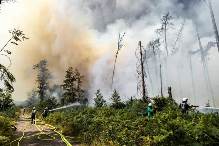 Rund 600 Einsatzkräfte seien vor Ort. Wegen auf dem Gelände lagernden Munitionsresten könnten sie den Brand hauptsächlich von außen bekämpfen. 20 Feuerwehrleute hätten zwischenzeitlich wegen Hitzefolgen oder Erschöpfung vom Rettungsdienst behandelt werden müssen.
