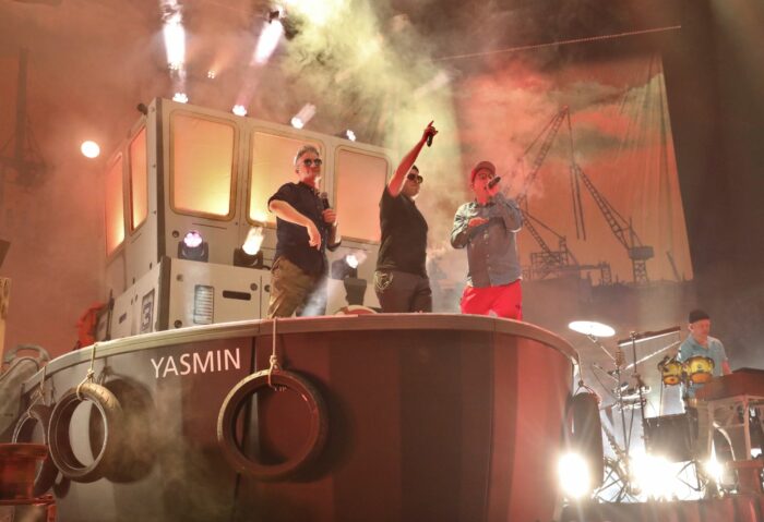 Mit riesigen Hafenkränen und Containern im Hintergrund, einer fliegenden Riesenmöwe und dem Kutter «Yasmin» auf der Bühne ist das Hip-Hop-Trio von Rostock aus zu seiner Abschiedstournee aufgebrochen. An Bord: Dokter Renz (Martin Vandreier, 48), König Boris (Boris Lauterbach, 48) und Björn Beton (Björn Warns, 49). Oder auch: Fettes Brot.