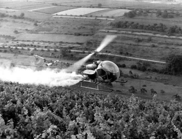 Alte Fotos aus den 1950er Jahren zeigen Helikopter, die es großflächig über rheinischen Weinbergen versprühen. Auf diesem Weg nahmen vermutlich Millionen Deutsche dieses Gift zu sich, aber nur in winzigsten Mengen.