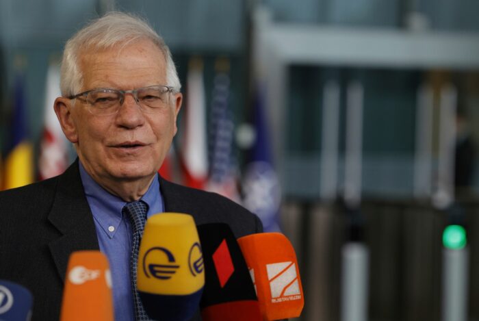Den russischen Krieg gegen die Ukraine beschrieb Borrell mit den Worten «Scheitern» und «Horror». Die russische Armee hinterlasse getötete Zivilisten und zerstörte Städte. Die erwartete Offensive Russlands im Osten der Ukraine erhöhe die Bereitschaft der EU, die Ukraine militärisch zu unterstützen. Sein Vorschlag für weitere 500 Millionen Euro aus EU-Mitteln für die Lieferung von Waffen und Ausrüstung an die ukrainischen Streitkräfte sei jedoch noch nicht beschlossen worden, weil es dafür noch die Ratifizierung einiger nationaler Parlamente brauche.