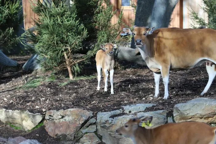 Hermann ist nach Angaben des Zoos seit Anbeginn agil und trinkt regelmäßig Milch bei seiner Mutter Ornella. Vater Buddy gilt als imposantes Tier mit typisch schwarzer Fellfarbe. Bantengs sind bedrohte asiatische Wildrinder. Sie leben unter anderem auf den großen Inseln Indonesiens.