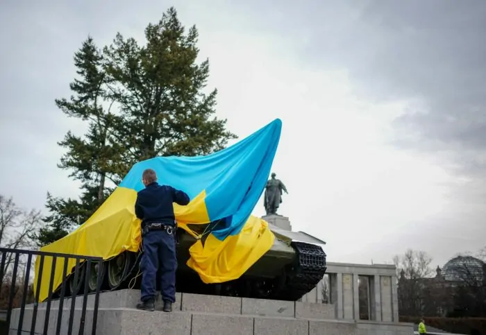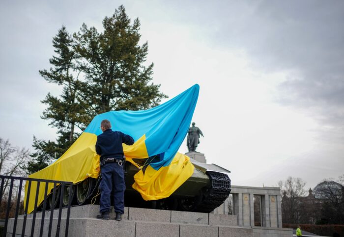 Zwei Weltkriegs-Panzer am Sowjetischen Ehrenmal nahe des Brandenburger Tores in Berlin sind mit je einer großen ukrainischen Fahne verhüllt worden.