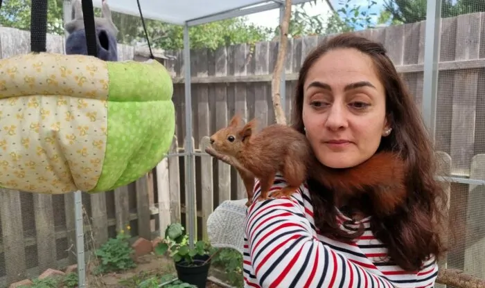 7 der aktuell 13 kleinen Mitbewohner leben bereits draußen. Zunächst in einer Außenvoliere auf Gharibs Grundstück, danach in einer größeren Voliere an einem geheimen Ort im Wald. 64 Eichhörnchen hat Mona Gharib bisher allein in diesem Jahr aufgenommen, ihr Mann unterstützt sie bei der Aufzucht. Insgesamt waren es in den vergangenen drei Jahren geschätzte 150 Tiere. «Eines von ihnen als „Bleibehörnchen“ zu behalten, kam mir nie in den Sinn», betont sie.