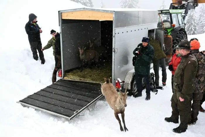 Dort warteten bereits Traktoren mit Schneeketten, um die Tiere zur Auswilderung auf die verschneite rund 1800 Meter hohe Benediktenwand zu bringen. Schneeregen dürfte ihnen die Eingewöhnung ohne Störungen durch Bergwanderer oder Gleitschirmflieger in den kommenden Tagen erleichtern. Das Projekt zeige, dass «Jägerinnen und Jäger auch Heger und Naturschützer sind», sagte Morlang. Das Steinwild unterliege dem Jagdrecht, werde aber ganzjährig geschont.