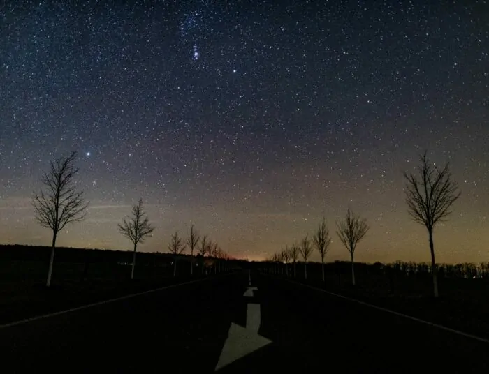 Im Nordosten leuchtet die helle gelbliche Kapella im Fuhrmann. Der Große Wagen rollt tief am Nordhimmel den Horizont entlang während die Kassiopeia, das Himmels-W, hoch im Osten eben emporsteigt.