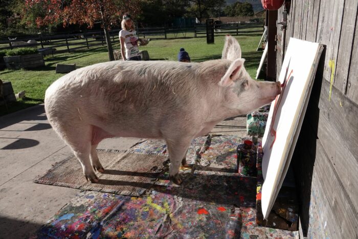 Für Lefson ist Pigcassos Begabung Mittel zum Zweck. Die Erlöse der Kunstwerke fließen zurück in den Gnadenhof, sagt Lefson, um den würdevollen Lebensabend Dutzender Bauernhoftiere zu finanzieren, die ursprünglich auf dem Abendbrotteller hätten landen sollen. «Mir geht es um weit mehr als Pigcassos Berühmtheit. Ich will zeigen, dass Schweine Wert haben, dass sie es verdienen, besser behandelt zu werden», sagt Lefson.