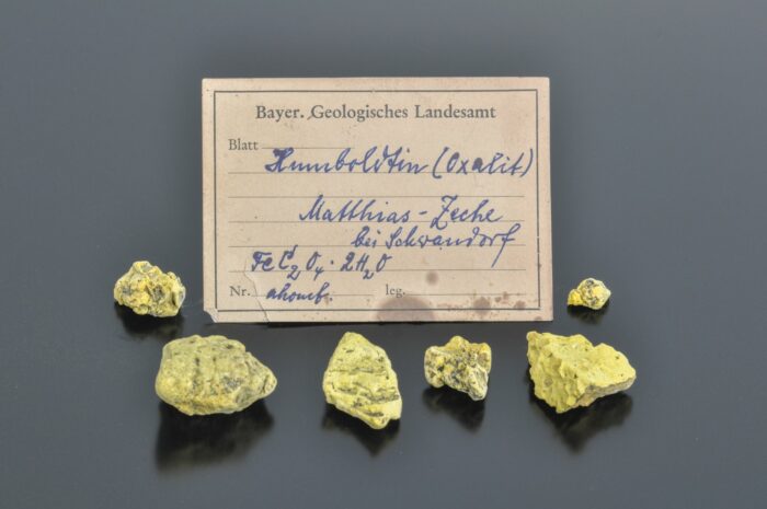 Es war lange Zeit nicht bekannt, dass sich diese Seltenheit in der Gesteinssammlung in Oberfranken befindet, wie er angibt. Gerade jetzt digitalisieren Mitarbeiter das Archiv der Sammlung. Dabei stießen sie auf einen 75 Jahre alten Brief, der über das Mineral berichtet. Im Katalog war es jedoch nicht aufgeführt. Daher durchsuchte das Team die gesamte Sammlung mit 130.000 Exponaten. Schließlich entdeckten sie in einer kleinen Schachtel die gelben Brocken zusammen mit dem Etikett.