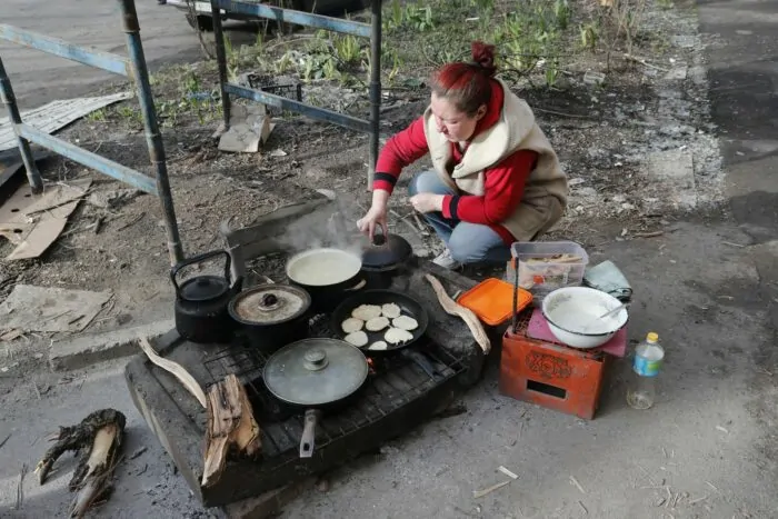 Eine Frau in Mariupol kocht am Straßenrand Essen. Die Hafenstadt ist seit dem 1. März vollständig von russischen Truppen eingeschlossen.