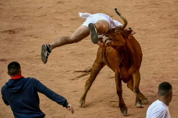 Das jahrhundertealte Fest zu Ehren des Stadtheiligen San Fermín hatte am Donnerstag begonnen und endet nächsten Freitag. Täglich werden am frühen Vormittag sechs zum Teil mehr als 600 Kilogramm schwere Kampfbullen und mehrere zahme Leitochsen durch die engen Gassen der Altstadt bis in die Arena gejagt. In dieser finden dann abends die Stierkämpfe statt.