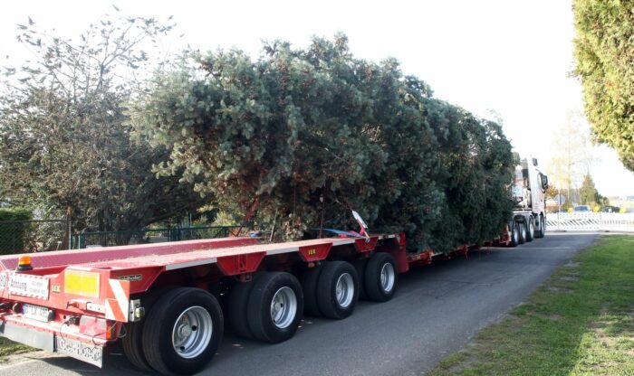 Der Transport war ursprünglich für die Nacht zum Dienstag geplant, doch die Tanne war auf dem Tieflader zu hoch für einen Tunnel in Berlin-Britz. Der Transporter fuhr deswegen gar nicht los.