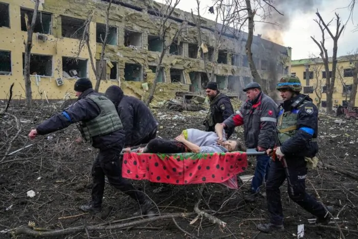 Das Foto vom 9. März 2022 für die Nachrichtenagentur AP hatte weltweit Menschen erschüttert. Es zeigt, wie eine verletzte hochschwangere Frau aus einer bombardierten Entbindungsklinik gebracht wird. Die Frau und ihr Kind starben wenig später.